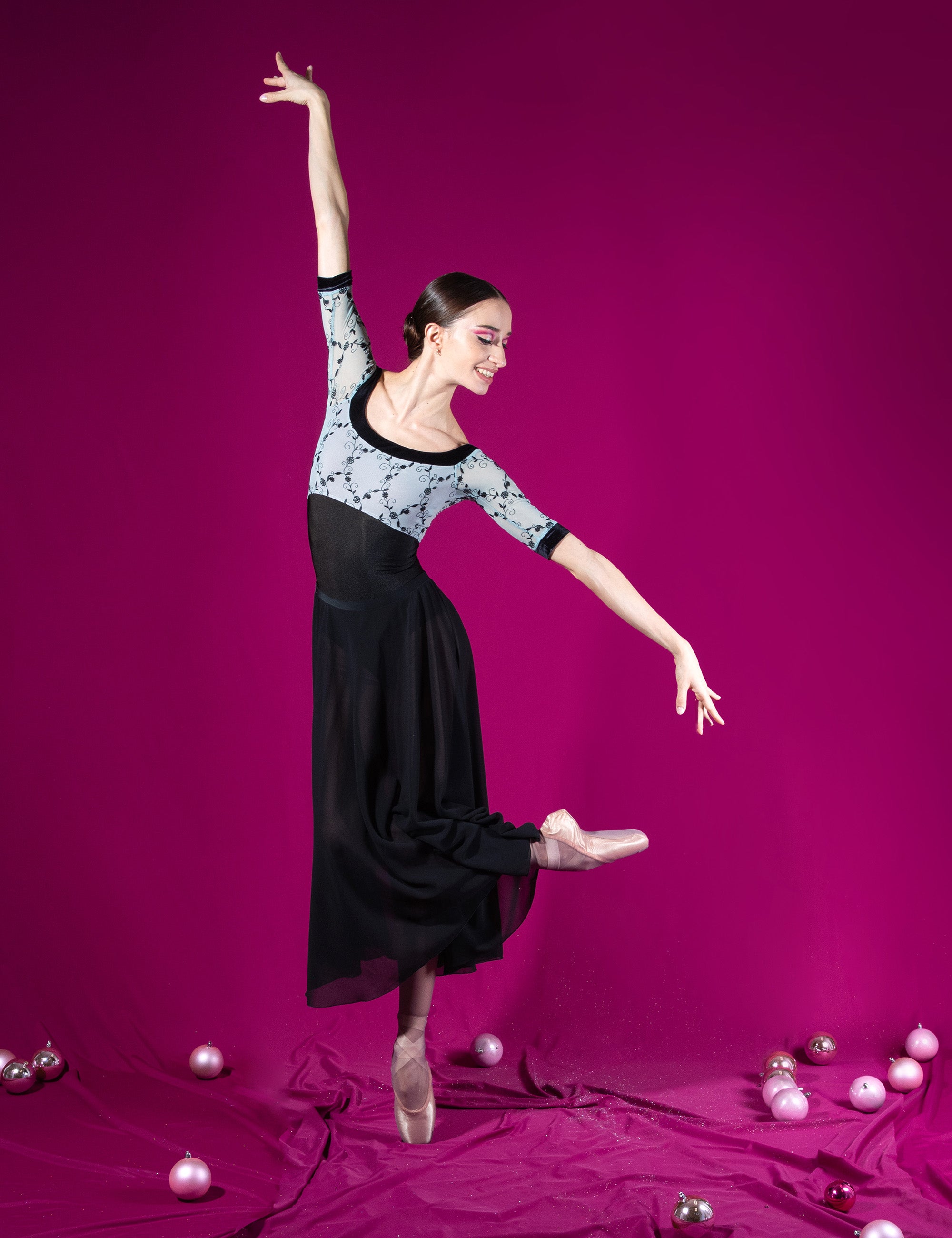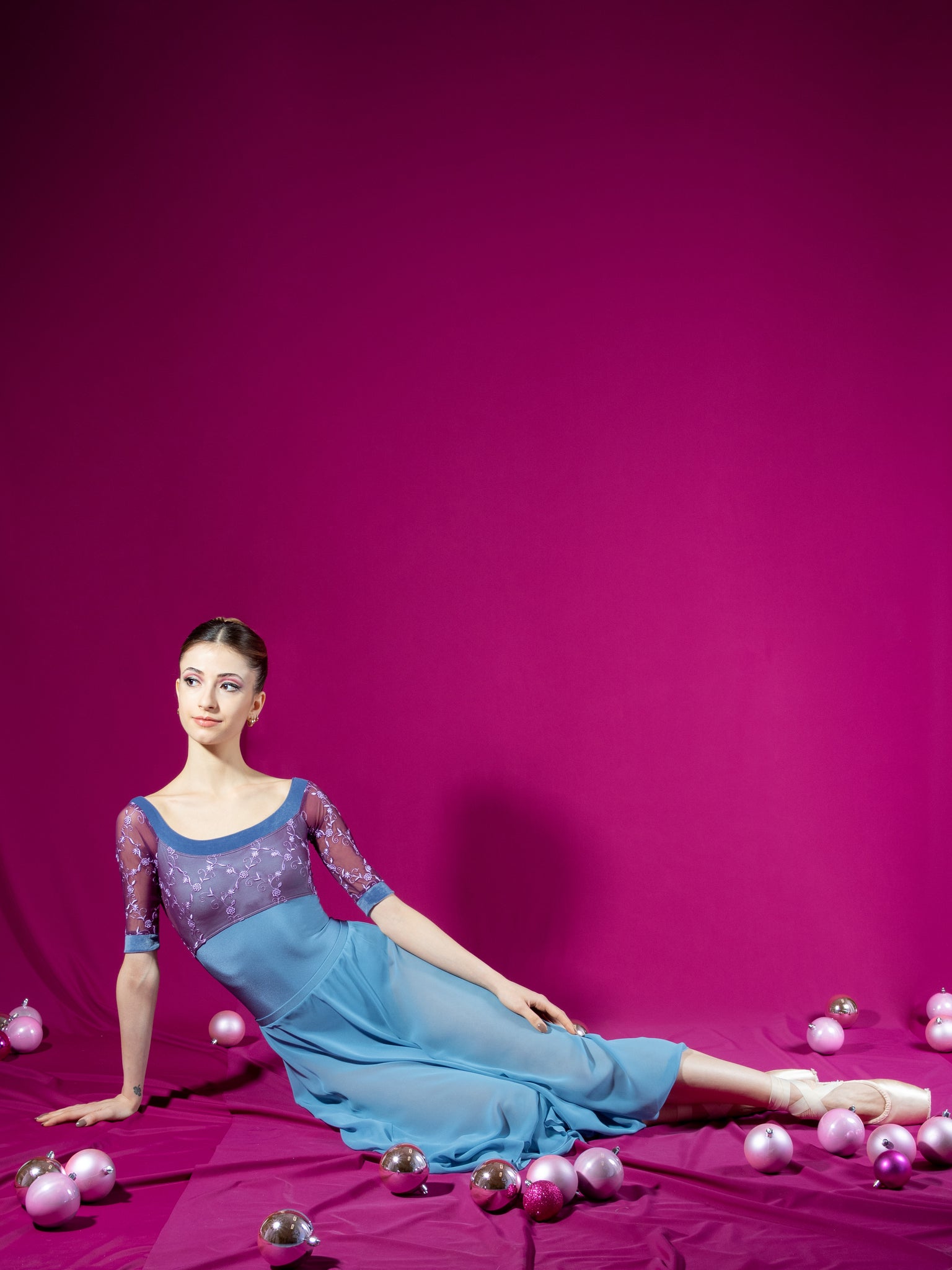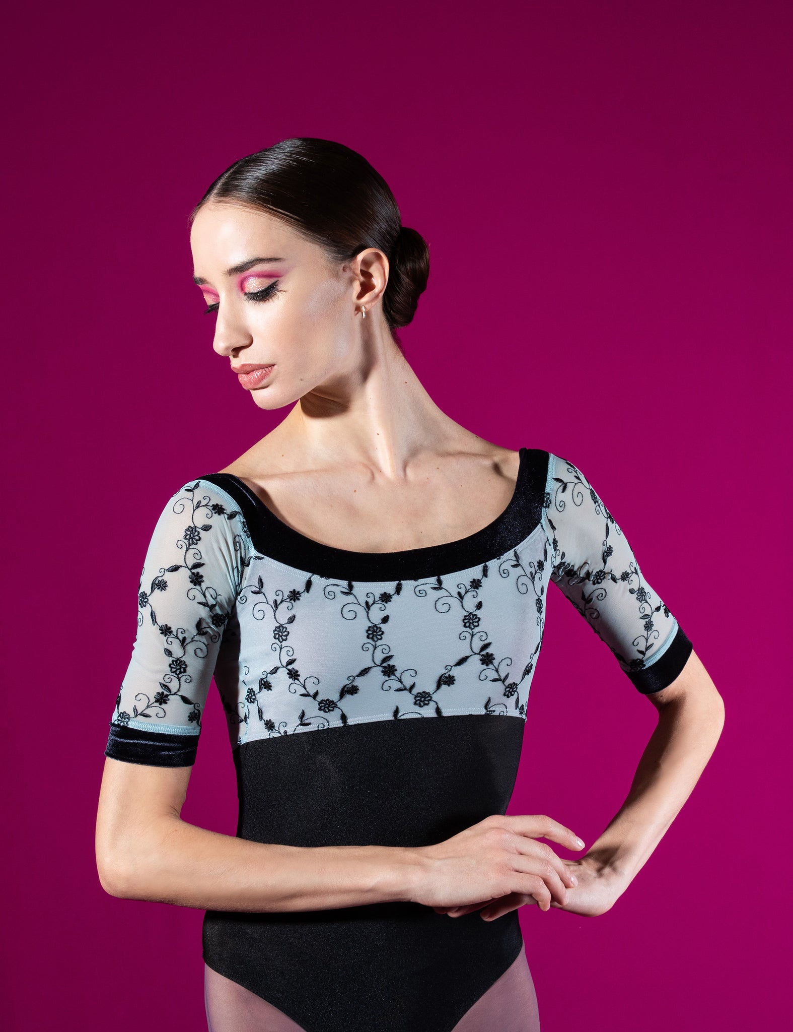 . Afrodite Il body CL è una creazione da sogno, perfetta per il guardaroba di ogni ballerina. Le sue maniche raglan, che si estendono con grazia sopra il gomito, sono progettate pensando sia al comfort che alle prestazioni. L'ampia scollatura arrotondata, rifinita con un bordo in velluto, incornicia splendidamente le clavicole, mentre il delicato tulle ricamato aggiunge un tocco di eterea eleganza. La rifinitura in velluto lungo la scollatura e i bordi delle maniche richiama la raffinata palette di colori del tessuto, creando un armonioso contrasto che esalta il fascino romantico e sofisticato del body.